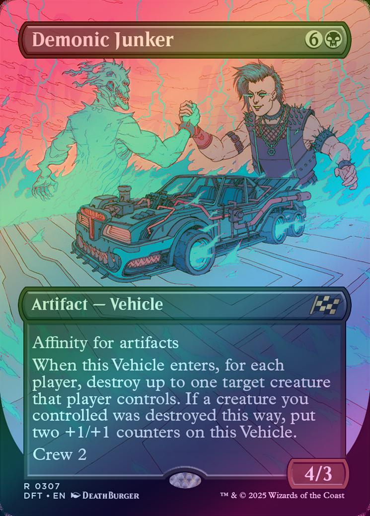 Demonic JunkerCasting Cost: Card Type: Artifact - VehiclePower/Toughness: 4/3Card Text: Affinity for artifacts (This spell costs less to cast for each artifact you control.) When this Vehicle enters, for each player, destroy up to one target creature that player controls. If a creature you controlled was destroyed this way, put two +1/+1 counters on this Vehicle. Crew 2Artist: Death Burger