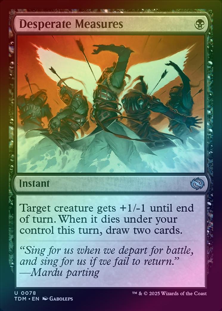 Desperate MeasuresCasting Cost: Card Type: InstantCard Text: Target creature gets +1/-1 until end of turn. When it dies under your control this turn, draw two cards.Flavour Text: "Sing for us when we depart for battle, and sing for us if we fail to return." -Mardu partingArtist: Gaboleps