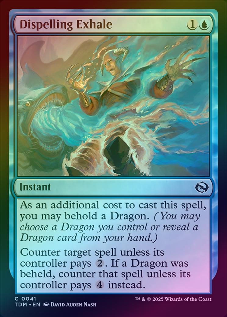 Dispelling ExhaleCasting Cost: Card Type: InstantCard Text: As an additional cost to cast this spell, you may behold a Dragon. (You may choose a Dragon you control or reveal a Dragon card from your hand.) Counter target spell unless its controller pays . If a Dragon was beheld, counter that spell unless its controller pays instead.Artist: David Auden Nash