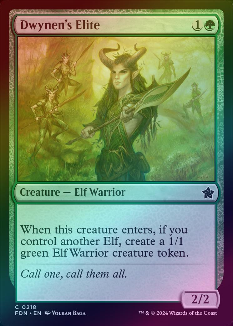 Dwynen's EliteCasting Cost: Card Type: Creature - Elf WarriorPower/Toughness: 2/2Card Text: When Dwynen's Elite enters, if you control another Elf, create a 1/1 green Elf Warrior creature token.Flavour Text: Call one, call them all.Artist: Volkan Baa