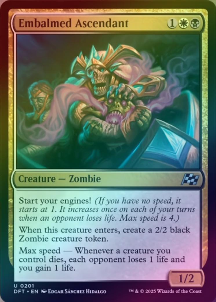 Embalmed AscendantCasting Cost: Card Type: Creature - ZombiePower/Toughness: 1/2Card Text: Start your engines! (If you have no speed, it starts at 1. It increases once on each of your turns when an opponent loses life. Max speed is 4.) When this creature enters, create a 2/2 black Zombie creature token. Max speed-Whenever a creature you control dies, each opponent loses 1 life and you gain 1 life.Artist: Edgar Snchez Hidalgo