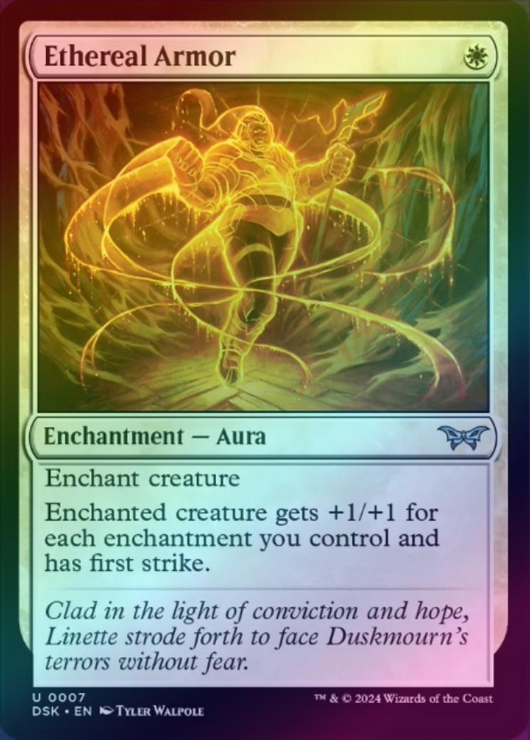Ethereal ArmorCasting Cost: Card Type: Enchantment - AuraCard Text: Enchant creature Enchanted creature gets +1/+1 for each enchantment you control and has first strike.Flavour Text: Clad in the light of conviction and hope, Linette strode forth to face Duskmourn's terrors without fear.Artist: Tyler Walpole
