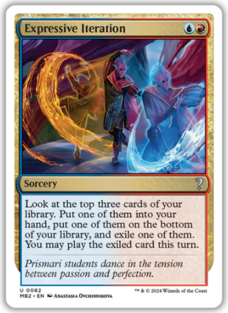 Expressive IterationCasting Cost: Card Type: SorceryCard Text: Look at the top three cards of your library. Put one of them into your hand, put one of them on the bottom of your library, and exile one of them. You may play the exiled card this turn.Flavour Text: Prismari students dance in the tension between passion and perfection.Artist: Anastasia Ovchinnikova