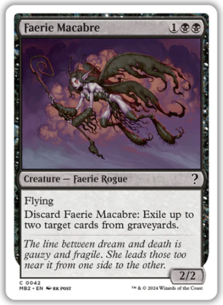 Faerie MacabreCasting Cost: Card Type: Creature - Faerie RoguePower/Toughness: 2/2Card Text: Flying Discard Faerie Macabre: Exile up to two target cards from graveyards.Flavour Text: The line between dream and death is gauzy and fragile. She leads those too near it from one side to the other.Artist: rk post
