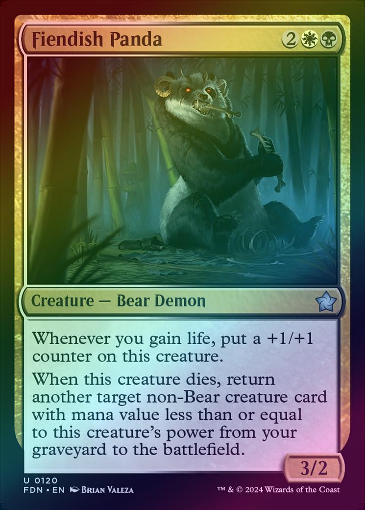 Fiendish PandaCasting Cost: Card Type: Creature - Bear DemonPower/Toughness: 3/2Card Text: Whenever you gain life, put a +1/+1 counter on this creature. When this creature dies, return another target non-Bear creature card with mana value less than or equal to this creature's power from your graveyard to the battlefield.Artist: Brian Valeza