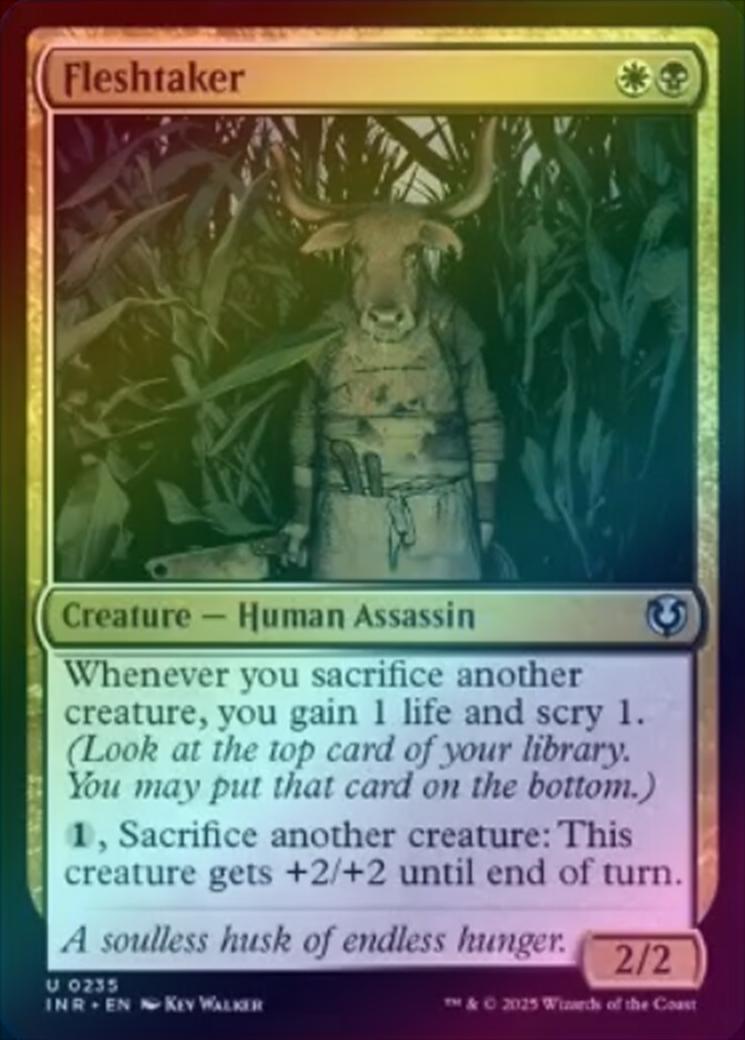 FleshtakerCasting Cost: Card Type: Creature - Human AssassinPower/Toughness: 2/2Card Text: Whenever you sacrifice another creature, you gain 1 life and scry 1. (Look at the top card of your library. You may put that card on the bottom.) , Sacrifice another creature: Fleshtaker gets +2/+2 until end of turn.Flavour Text: A soulless husk of endless hunger.Artist: Kev Walker