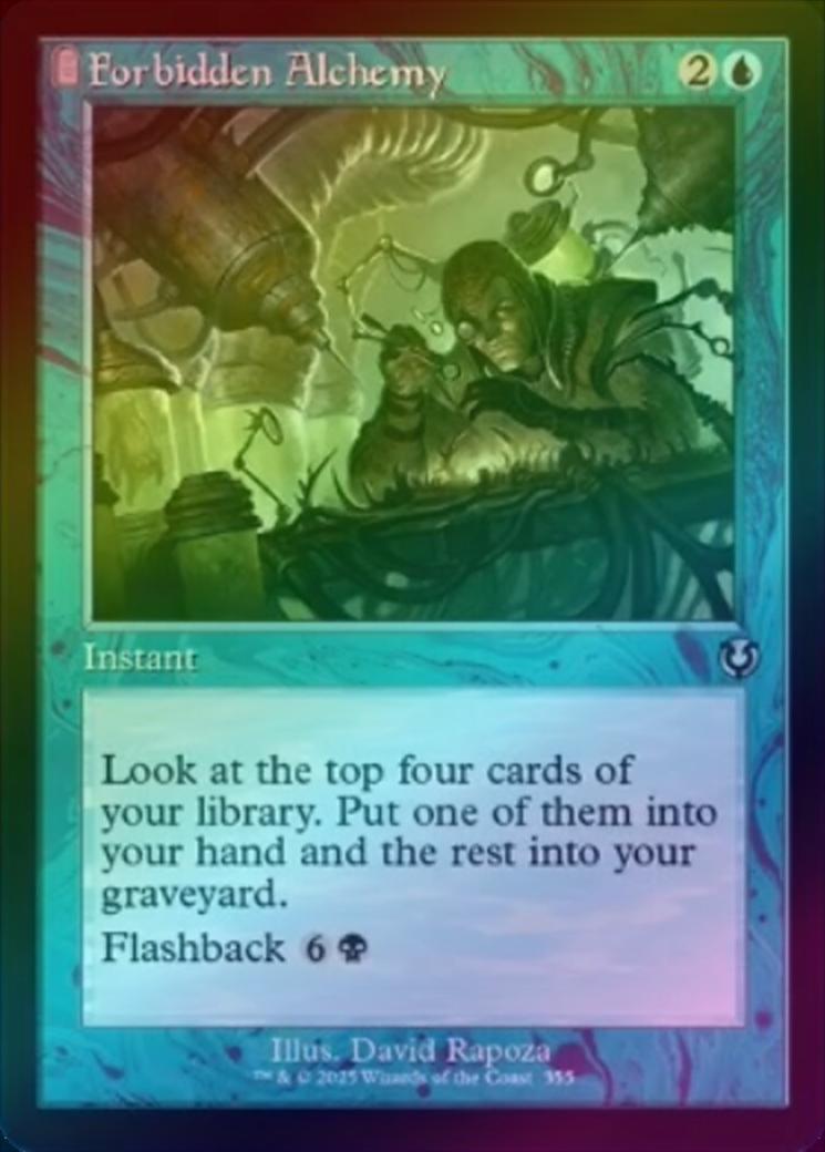 Forbidden AlchemyCasting Cost: Card Type: InstantCard Text: Look at the top four cards of your library. Put one of them into your hand and the rest into your graveyard. Flashback (You may cast this card from your graveyard for its flashback cost. Then exile it.)Artist: David Rapoza