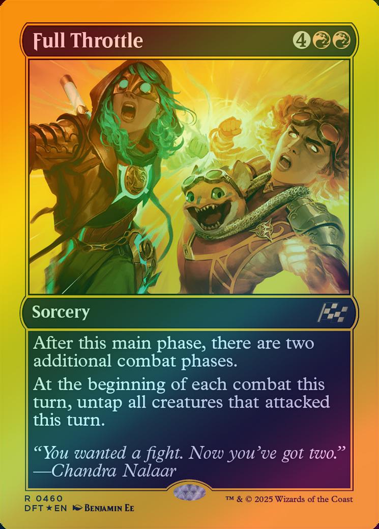 Full ThrottleCasting Cost: Card Type: SorceryCard Text: After this main phase, there are two additional combat phases. At the beginning of each combat this turn, untap all creatures that attacked this turn.Flavour Text: "You wanted a fight. Now you've got two." -Chandra NalaarArtist: Benjamin Ee