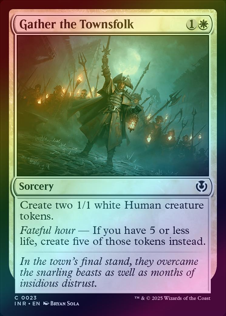 Gather the TownsfolkCasting Cost: Card Type: SorceryCard Text: Create two 1/1 white Human creature tokens. Fateful hour - If you have 5 or less life, create five of those tokens instead.Flavour Text: In the town's final stand, they overcame the snarling beasts as well as months of insidious distrust.Artist: Bryan Sola