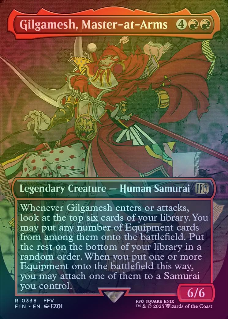 Gilgamesh, Master-at-ArmsCasting Cost: Card Type: Legendary Creature - Human SamuraiPower/Toughness: 6/6Card Text: Whenever Gilgamesh enters or attacks, look at the top six cards of your library. You may put any number of Equipment cards from among them onto the battlefield. Put the rest on the bottom of your library in a random order. When you put one or more Equipment onto the battlefield this way, you may attach one of them to a Samurai you control.Artist: Ezoi