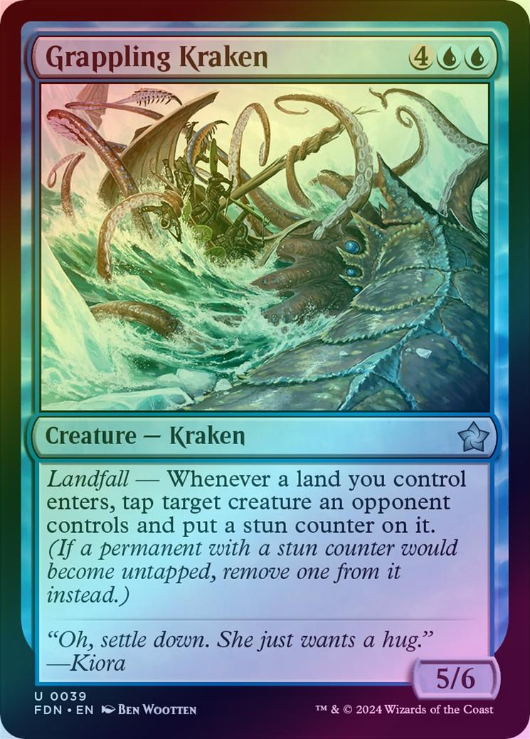 Grappling KrakenCasting Cost: Card Type: Creature - KrakenPower/Toughness: 5/6Card Text: Landfall - Whenever a land you control enters, tap target creature an opponent controls and put a stun counter on it. (If a permanent with a stun counter would become untapped, remove one from it instead.)Flavour Text: "Oh, settle down. She just wants a hug." -KioraArtist: Ben Wootten