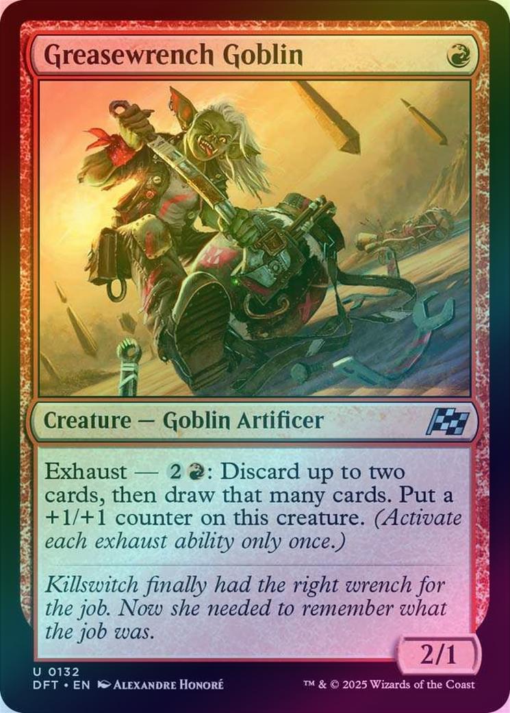 Greasewrench GoblinCasting Cost: Card Type: Creature - Goblin ArtificerPower/Toughness: 2/1Card Text: Exhaust - : Discard up to two cards, then draw that many cards. Put a +1/+1 counter on this creature. (Activate each exhaust ability only once.)Flavour Text: Killswitch finally had the right wrench for the job. Now she needed to remember what the job was.Artist: Alexandre Honor