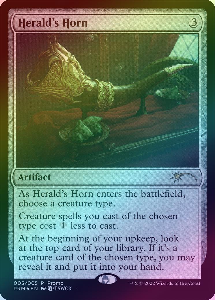 Herald's HornCasting Cost: Card Type: ArtifactCard Text: As Herald's Horn enters, choose a creature type. Creature spells you cast of the chosen type cost less to cast. At the beginning of your upkeep, look at the top card of your library. If it's a creature card of the chosen type, you may reveal it and put it into your hand.Artist: TSWCK