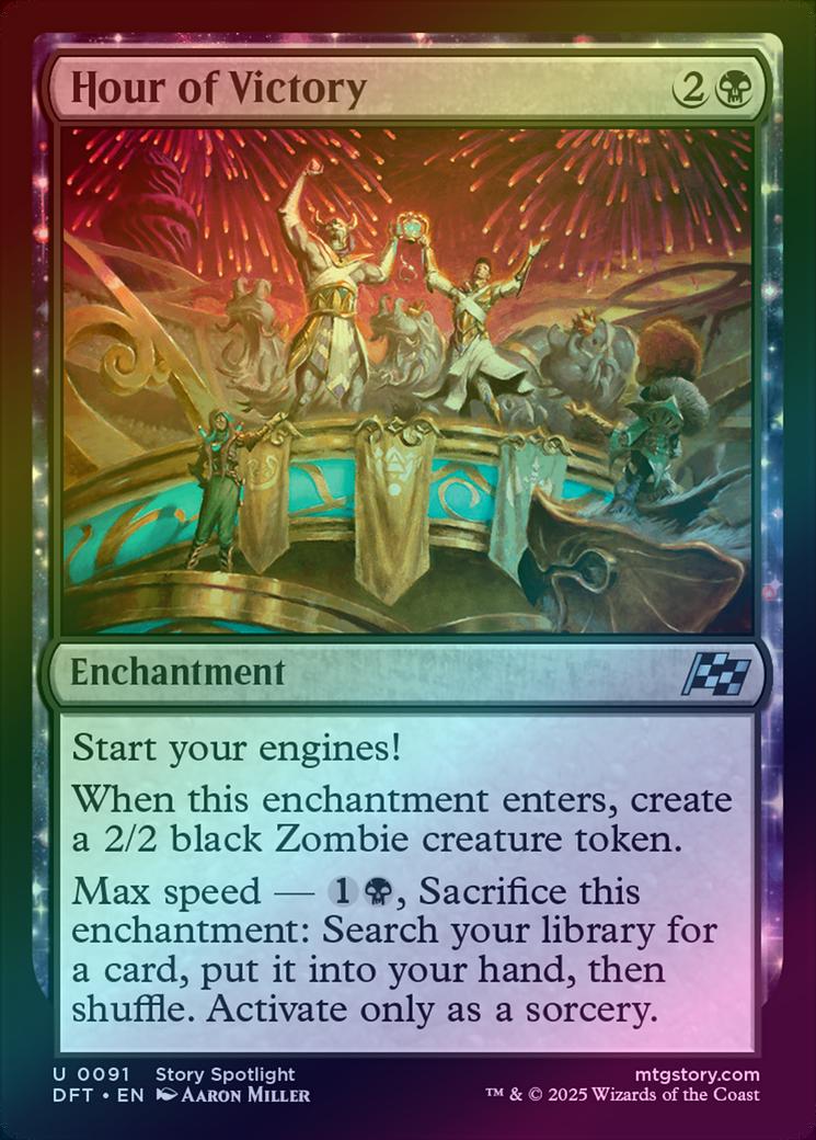 Hour of VictoryCasting Cost: Card Type: EnchantmentCard Text: Start your engines! When this enchantment enters, create a 2/2 black Zombie creature token. Max speed - , Sacrifice this enchantment: Search your library for a card, put it into your hand, then shuffle. Activate only as a sorcery.Artist: Aaron Miller