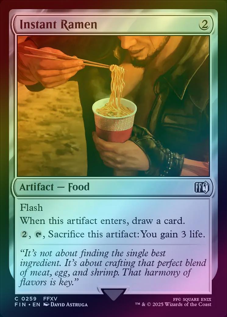 Instant RamenCasting Cost: Card Type: Artifact - FoodCard Text: Flash When this artifact enters, draw a card. , , Sacrifice this artifact: You gain 3 life.Flavour Text: "It's not about finding the single best ingredient. It's about crafting that perfect blend of meat, egg, and shrimp. That harmony of flavors is key."Artist: David Astruga