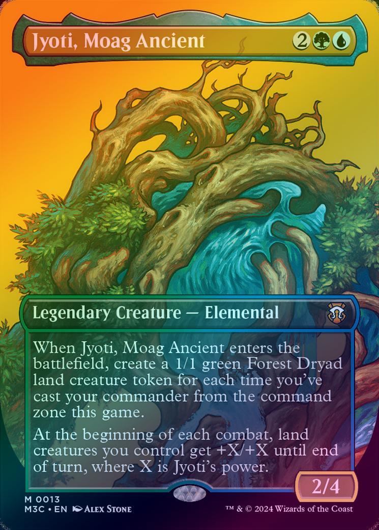 Jyoti, Moag AncientCasting Cost: Card Type: Legendary Creature - ElementalPower/Toughness: 2/4Card Text: When Jyoti, Moag Ancient enters, create a 1/1 green Forest Dryad land creature token for each time you've cast your commander from the command zone this game. (They're affected by summoning sickness.) At the beginning of each combat, land creatures you control get +X/+X until end of turn, where X is Jyoti's power.Artist: Alex Stone