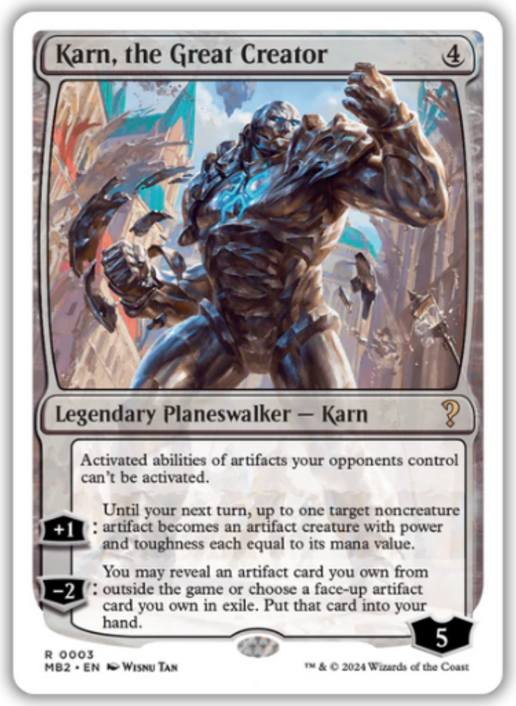 Karn, the Great CreatorCasting Cost: Card Type: Legendary Planeswalker - KarnLoyalty: 5Card Text: Activated abilities of artifacts your opponents control can't be activated. +1: Until your next turn, up to one target noncreature artifact becomes an artifact creature with power and toughness each equal to its mana value. -2: You may reveal an artifact card you own from outside the game or choose a face-up artifact card you own in exile. Put that card into your hand.Artist: Wisnu Tan