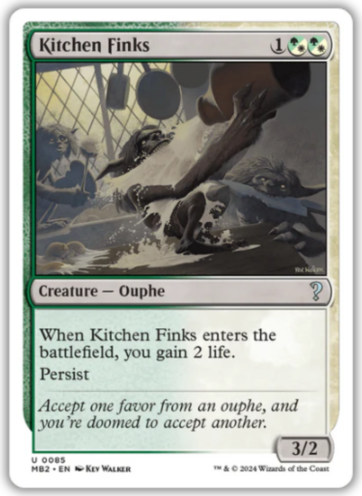 Kitchen FinksCasting Cost: Card Type: Creature - OuphePower/Toughness: 3/2Card Text: When Kitchen Finks enters, you gain 2 life. Persist (When this creature dies, if it had no -1/-1 counters on it, return it to the battlefield under its owner's control with a -1/-1 counter on it.)Flavour Text: Accept one favor from an ouphe, and you're doomed to accept another.Artist: Kev Walker