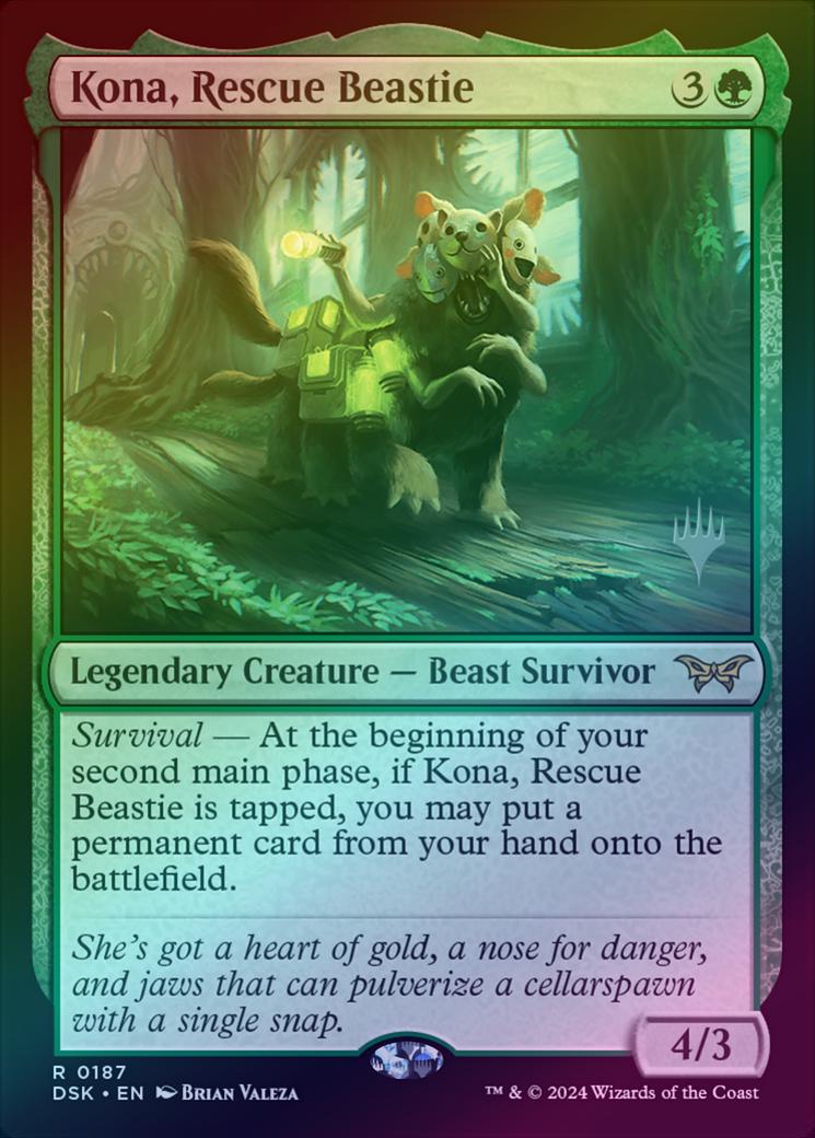 Kona, Rescue BeastieCasting Cost: Card Type: Legendary Creature - Beast SurvivorPower/Toughness: 4/3Card Text: Survival - At the beginning of your second main phase, if Kona, Rescue Beastie is tapped, you may put a permanent card from your hand onto the battlefield.Flavour Text: She's got a heart of gold, a nose for danger, and jaws that can pulverize a cellarspawn with a single snap.Artist: Brian Valeza