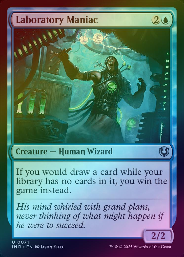 Laboratory ManiacCasting Cost: Card Type: Creature - Human WizardPower/Toughness: 2/2Card Text: If you would draw a card while your library has no cards in it, you win the game instead.Flavour Text: His mind whirled with grand plans, never thinking of what might happen if he were to succeed.Artist: Jason Felix