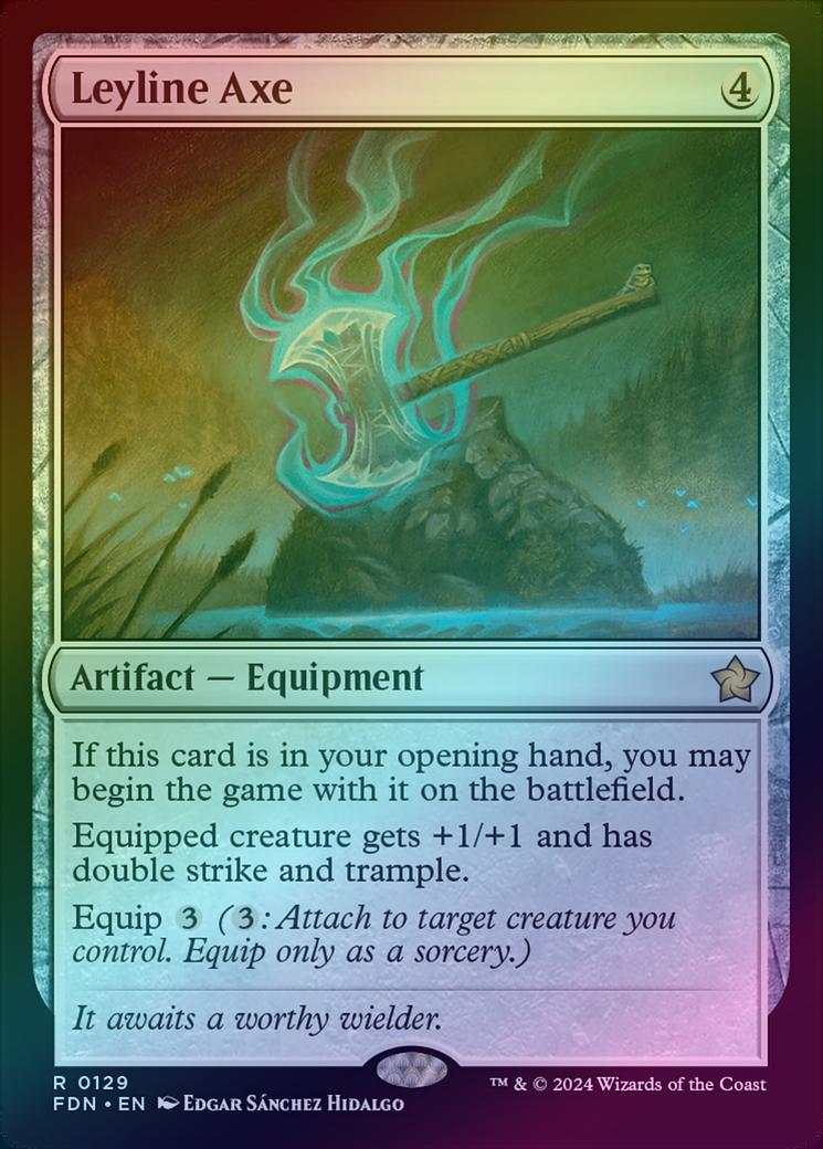 Leyline AxeCasting Cost: Card Type: Artifact - EquipmentCard Text: If this card is in your opening hand, you may begin the game with it on the battlefield. Equipped creature gets +1/+1 and has double strike and trample. Equip (: Attach to target creature you control. Equip only as a sorcery.)Flavour Text: It awaits a worthy wielder.Artist: Edgar Snchez Hidalgo
