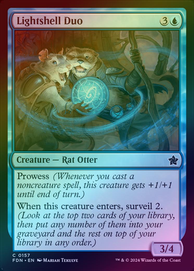 Lightshell DuoCasting Cost: Card Type: Creature - Rat OtterPower/Toughness: 3/4Card Text: Prowess (Whenever you cast a noncreature spell, this creature gets +1/+1 until end of turn.) When Lightshell Duo enters, surveil 2. (Look at the top two cards of your library, then put any number of them into your graveyard and the rest on top of your library in any order.)Artist: Mariah Tekulve