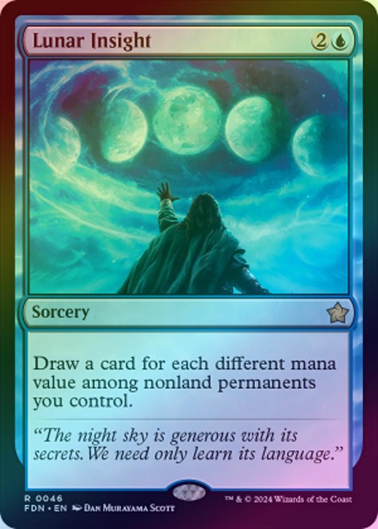 Lunar InsightCasting Cost: Card Type: SorceryCard Text: Draw a card for each different mana value among nonland permanents you control.Flavour Text: "The night sky is generous with its secrets. We need only learn its language."Artist: Dan Murayama Scott