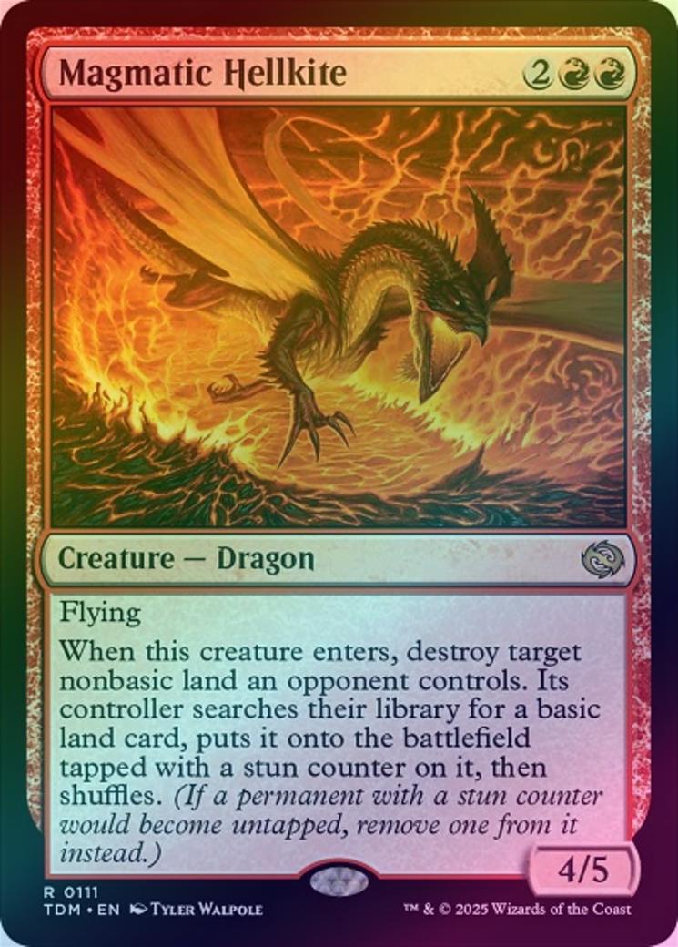 Magmatic HellkiteCasting Cost: Card Type: Creature - DragonPower/Toughness: 4/5Card Text: Flying When this creature enters, destroy target nonbasic land an opponent controls. Its controller searches their library for a basic land card, puts it onto the battlefield tapped with a stun counter on it, then shuffles. (If a permanent with a stun counter would become untapped, remove one from it instead.)Artist: Tyler Walpole