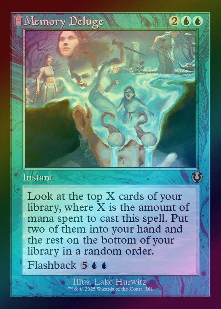 Memory DelugeCasting Cost: Card Type: InstantCard Text: Look at the top X cards of your library, where X is the amount of mana spent to cast this spell. Put two of them into your hand and the rest on the bottom of your library in a random order. Flashback (You may cast this card from your graveyard for its flashback cost. Then exile it.)Artist: Lake Hurwitz