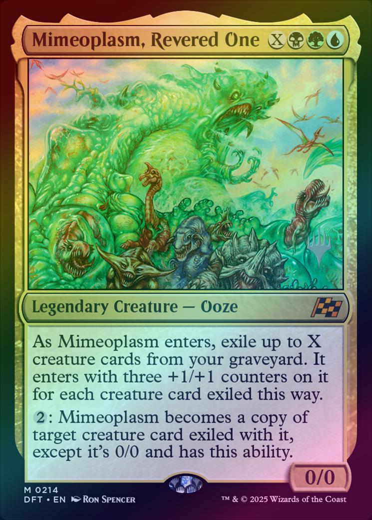 Mimeoplasm, Revered OneCasting Cost: Card Type: Legendary Creature - OozePower/Toughness: 0/0Card Text: As Mimeoplasm enters, exile up to X creature cards from your graveyard. It enters with three +1/+1 counters on it for each creature card exiled this way. : Mimeoplasm becomes a copy of target creature card exiled with it, except it's 0/0 and has this ability.Artist: Ron Spencer