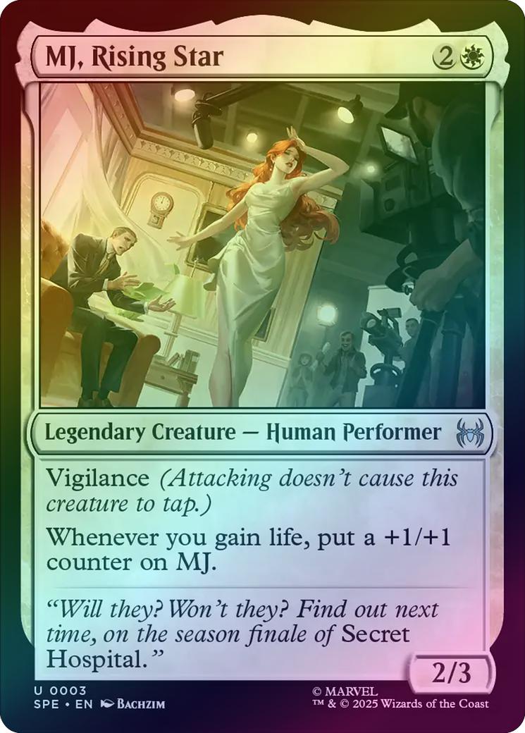 MJ, Rising StarCasting Cost: Card Type: Legendary Creature - Human PerformerPower/Toughness: 2/3Card Text: Vigilance (Attacking doesn't cause this creature to tap.) Whenever you gain life, put a +1/+1 counter on MJ.Flavour Text: "Will they? Won't they? Find out next time, on the season finale of *Secret Hospital.*"Artist: Bachzim