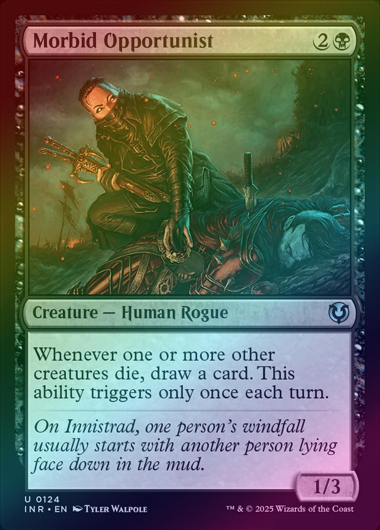 Morbid OpportunistCasting Cost: Card Type: Creature - Human RoguePower/Toughness: 1/3Card Text: Whenever one or more other creatures die, draw a card. This ability triggers only once each turn.Flavour Text: On Innistrad, one person's windfall usually starts with another person lying face down in the mud.Artist: Tyler Walpole