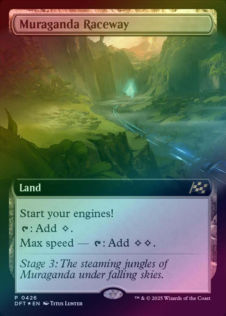 Muraganda RacewayCard Type: LandCard Text: Start your engines! (If you have no speed, it starts at 1. It increases once on each of your turns when an opponent loses life. Max speed is 4.) : Add . Max speed - : Add .Flavour Text: Stage 3: The steaming jungles of Muraganda under falling skies.Artist: Titus Lunter