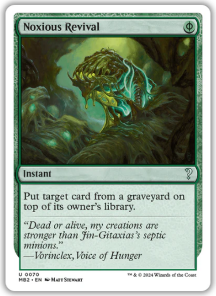 Noxious RevivalCasting Cost: Card Type: InstantCard Text: ( can be paid with either or 2 life.) Put target card from a graveyard on top of its owner's library.Flavour Text: "Dead or alive, my creations are stronger than Jin-Gitaxias's septic minions." -Vorinclex, Voice of HungerArtist: Matt Stewart