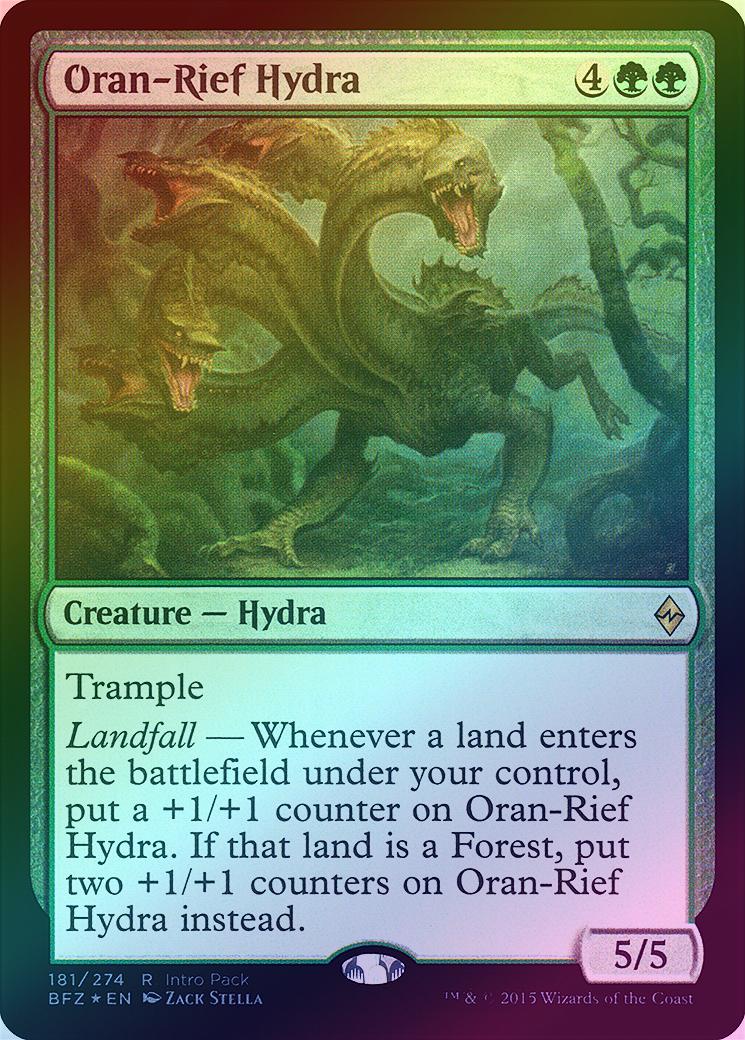 Oran-Rief HydraCasting Cost: Card Type: Creature - HydraPower/Toughness: 5/5Card Text: Trample Landfall - Whenever a land enters the battlefield under your control, put a +1/+1 counter on Oran-Rief Hydra. If that land is a Forest, put two +1/+1 counters on Oran-Rief Hydra instead.Artist: Zack Stella