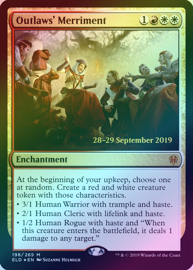 Outlaws' MerrimentCasting Cost: Card Type: EnchantmentCard Text: At the beginning of your upkeep, choose one at random. Create a red and white creature token with those characteristics. - 3/1 Human Warrior with trample and haste. - 2/1 Human Cleric with lifelink and haste. - 1/2 Human Rogue with haste and "When this creature enters, it deals 1 damage to any target."Artist: Suzanne Helmigh
