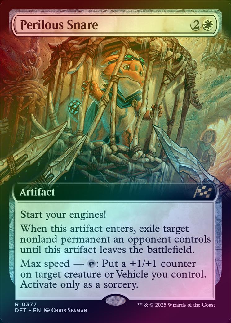 Perilous SnareCasting Cost: Card Type: ArtifactCard Text: Start your engines! (If you have no speed, it starts at 1. It increases once on each of your turns when an opponent loses life. Max speed is 4.) When this artifact enters, exile target nonland permanent an opponent controls until this artifact leaves the battlefield. Max speed - : Put a +1/+1 counter on target creature or Vehicle you control. Activate only as a sorcery.Artist: Chris Seaman