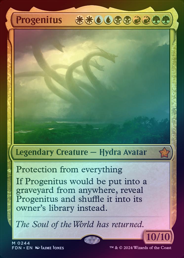 ProgenitusCasting Cost: Card Type: Legendary Creature - Hydra AvatarPower/Toughness: 10/10Card Text: Protection from everything If Progenitus would be put into a graveyard from anywhere, reveal Progenitus and shuffle it into its owner's library instead.Flavour Text: The Soul of the World has returned.Artist: Jaime Jones