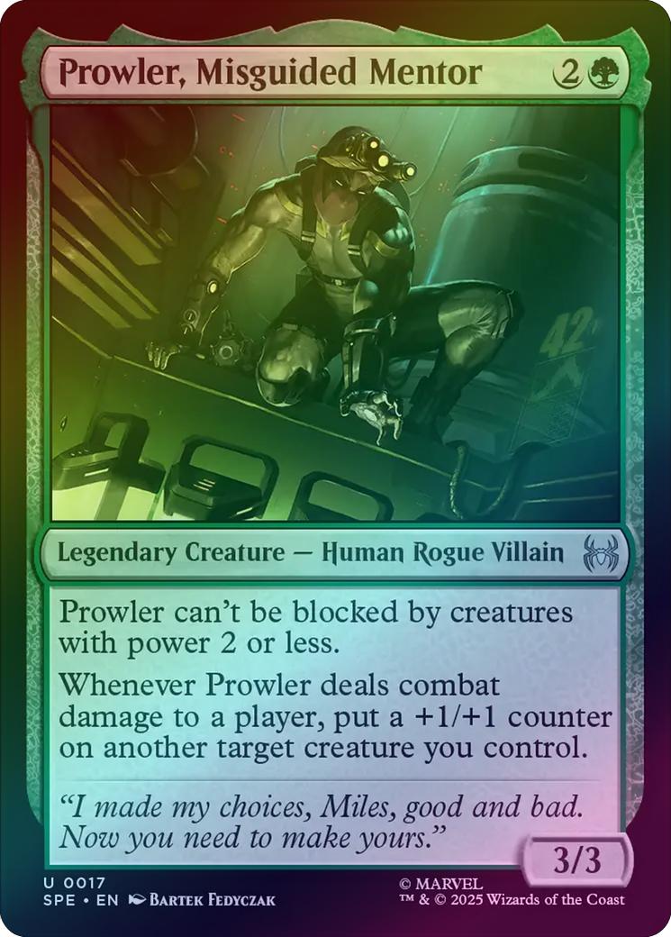 Prowler, Misguided MentorCasting Cost: Card Type: Legendary Creature - Human Rogue VillainPower/Toughness: 3/3Card Text: Prowler can't be blocked by creatures with power 2 or less. Whenever Prowler deals combat damage to a player, put a +1/+1 counter on another target creature you control.Flavour Text: "I made my choices, Miles, good and bad. Now you need to make yours."Artist: Bartek Fedyczak