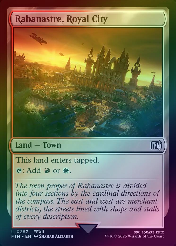 Rabanastre, Royal CityCard Type: Land - TownCard Text: This land enters tapped. : Add or .Flavour Text: The town proper of Rabanastre is divided into four sections by the cardinal directions of the compass. The east and west are merchant districts, the streets lined with shops and stalls of every description.Artist: Shahab Alizadeh