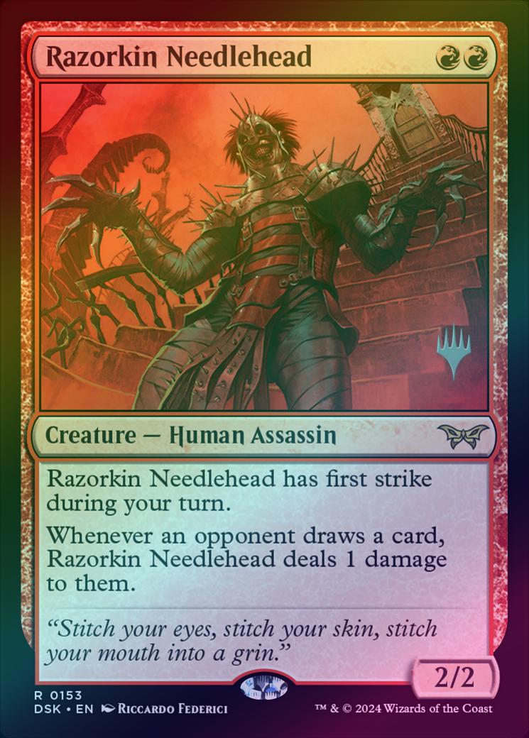Razorkin NeedleheadCasting Cost: Card Type: Creature - Human AssassinPower/Toughness: 2/2Card Text: Razorkin Needlehead has first strike during your turn. Whenever an opponent draws a card, Razorkin Needlehead deals 1 damage to them.Flavour Text: "Stitch your eyes, stitch your skin, stitch your mouth into a grin."Artist: Riccardo Federici