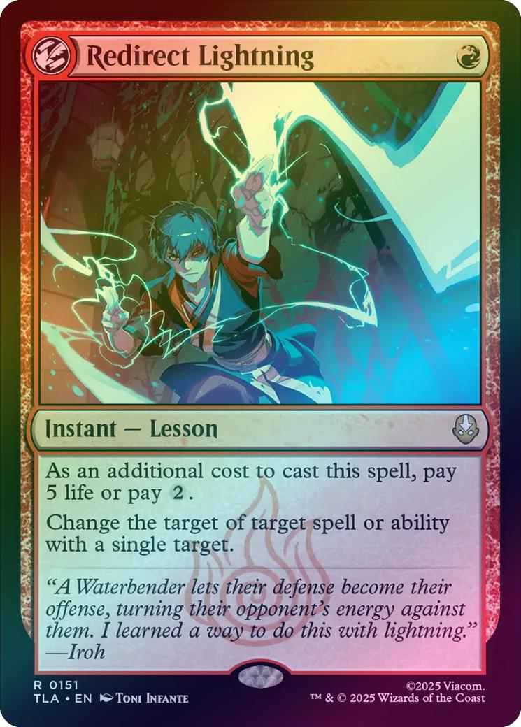Redirect LightningCasting Cost: Card Type: Instant - LessonCard Text: As an additional cost to cast this spell, pay 5 life or pay . Change the target of target spell or ability with a single target.Flavour Text: "A Waterbender lets their defense become their offense, turning their opponent's energy against them. I learned a way to do this with lightning." -IrohArtist: Toni Infante