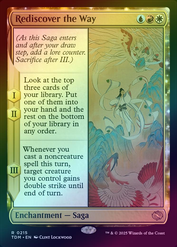 Rediscover the WayCasting Cost: Card Type: Enchantment - SagaCard Text: (As this Saga enters and after your draw step, add a lore counter. Sacrifice after III.) I, II - Look at the top three cards of your library. Put one of them into your hand and the rest on the bottom of your library in any order. III - Whenever you cast a noncreature spell this turn, target creature you control gains double strike until end of turn.Artist: Clint Lockwood