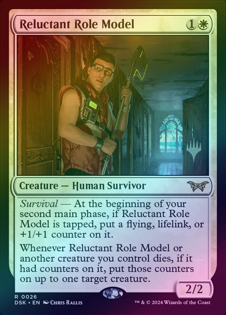 Reluctant Role ModelCasting Cost: Card Type: Creature - Human SurvivorPower/Toughness: 2/2Card Text: Survival - At the beginning of your second main phase, if Reluctant Role Model is tapped, put a flying, lifelink, or +1/+1 counter on it. Whenever Reluctant Role Model or another creature you control dies, if it had counters on it, put those counters on up to one target creature.Artist: Chris Rallis