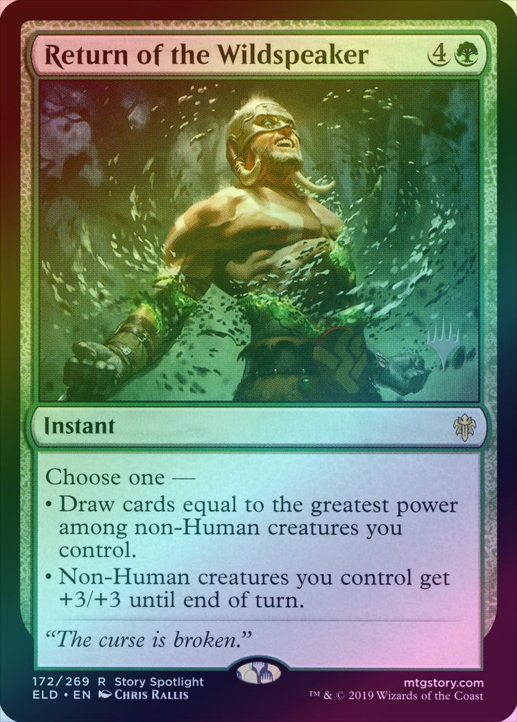 Return of the WildspeakerCasting Cost: Card Type: InstantCard Text: Choose one - - Draw cards equal to the greatest power among non-Human creatures you control. - Non-Human creatures you control get +3/+3 until end of turn.Flavour Text: "The curse is broken."Artist: Chris Rallis