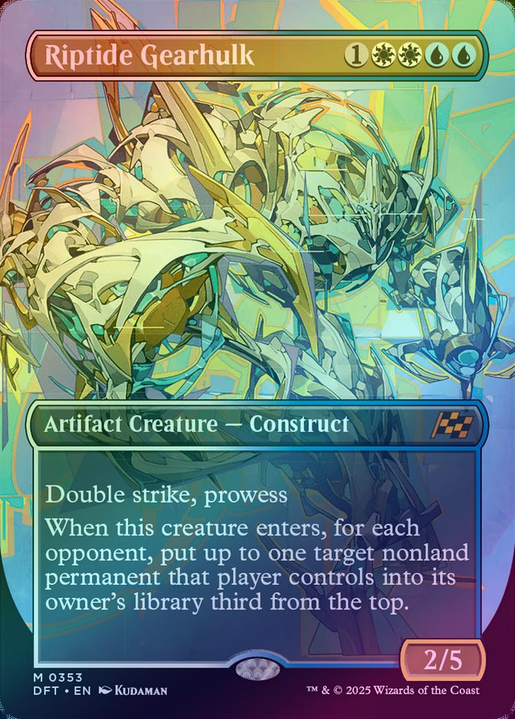 Riptide GearhulkCasting Cost: Card Type: Artifact Creature - ConstructPower/Toughness: 2/5Card Text: Double strike Prowess (Whenever you cast a noncreature spell, this creature gets +1/+1 until end of turn.) When this creature enters, for each opponent, put up to one target nonland permanent that player controls into its owner's library third from the top.Artist: Kudaman