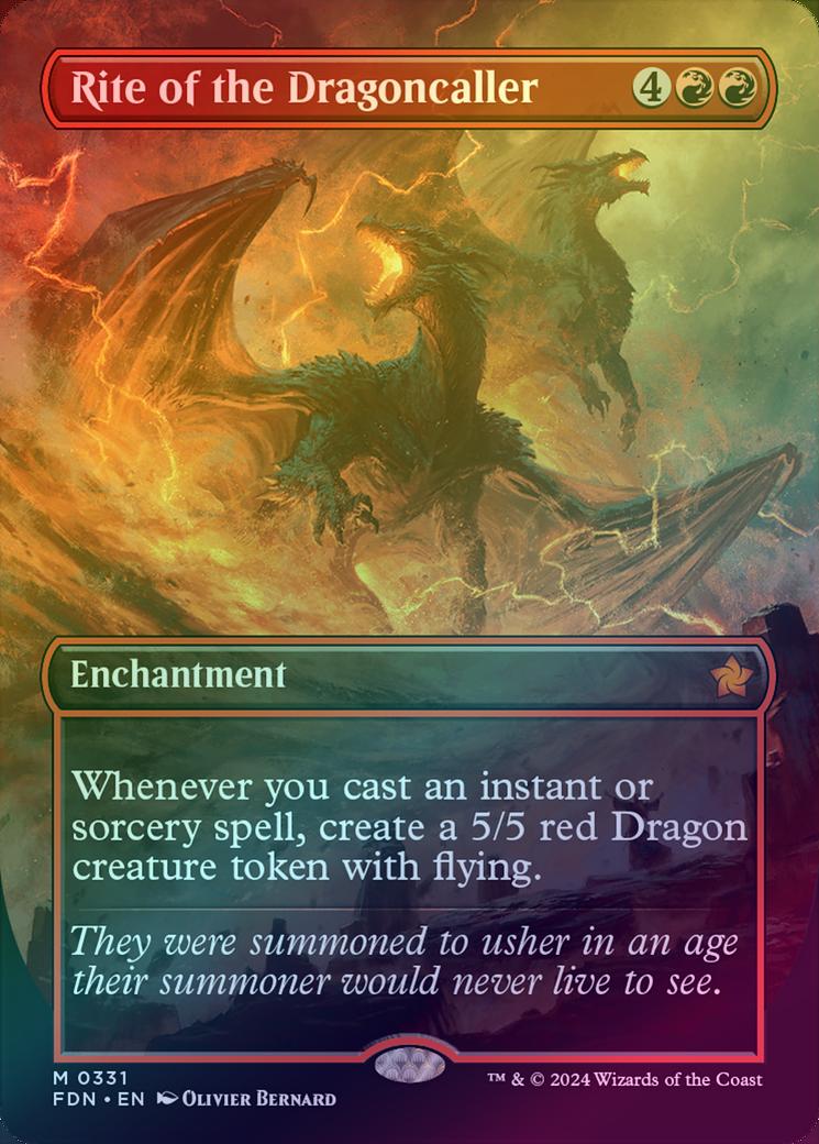 Rite of the DragoncallerCasting Cost: Card Type: EnchantmentCard Text: Whenever you cast an instant or sorcery spell, create a 5/5 red Dragon creature token with flying.Flavour Text: They were summoned to usher in an age their summoner would never live to see.Artist: Olivier Bernard