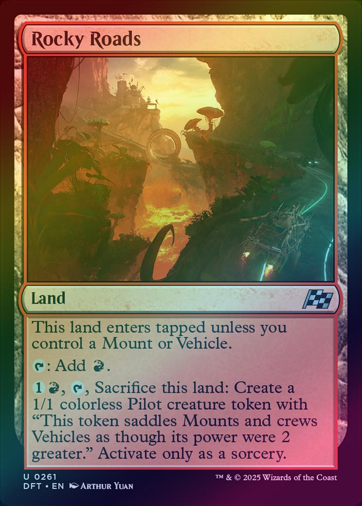 Rocky RoadsCard Type: LandCard Text: This land enters tapped unless you control a Mount or Vehicle. : Add . , , Sacrifice this land: Create a 1/1 colorless Pilot creature token with "This token saddles Mounts and crews Vehicles as though its power were 2 greater." Activate only as a sorcery.Artist: Arthur Yuan