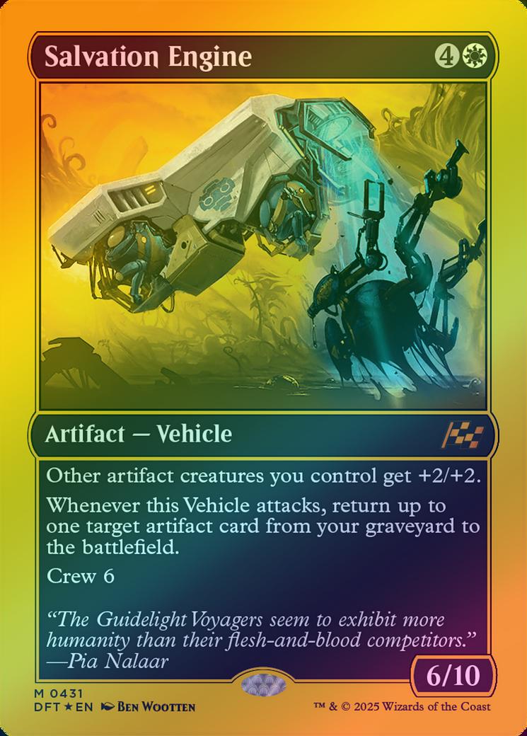 Salvation EngineCasting Cost: Card Type: Artifact - VehiclePower/Toughness: 6/10Card Text: Other artifact creatures you control get +2/+2. Whenever this Vehicle attacks, return up to one target artifact card from your graveyard to the battlefield. Crew 6Flavour Text: "The Guidelight Voyagers seem to exhibit more humanity than their flesh-and-blood competitors." -Pia NalaarArtist: Ben Wootten