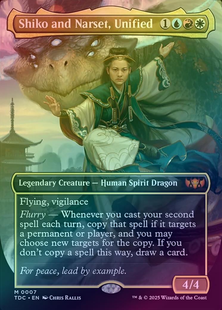 Shiko and Narset, UnifiedCasting Cost: Card Type: Legendary Creature - Human Spirit DragonPower/Toughness: 4/4Card Text: Flying, vigilance Flurry - Whenever you cast your second spell each turn, copy that spell if it targets a permanent or player, and you may choose new targets for the copy. If you don't copy a spell this way, draw a card.Flavour Text: For peace, lead by example.Artist: Chris Rallis